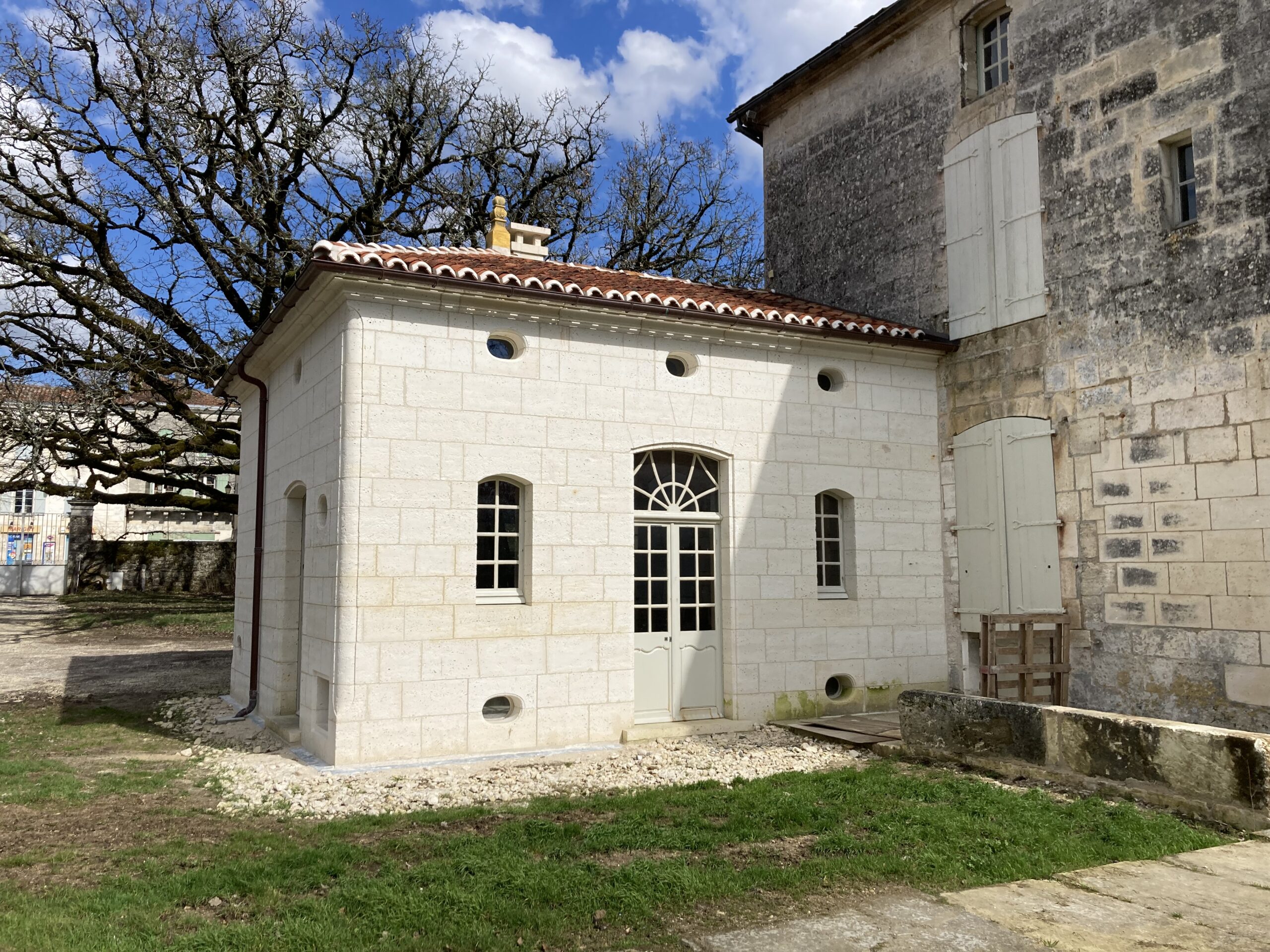 Réalisation d’une extension avec briques côté intérieure et moellons/pierres face extérieure sur une maison de maître (24).