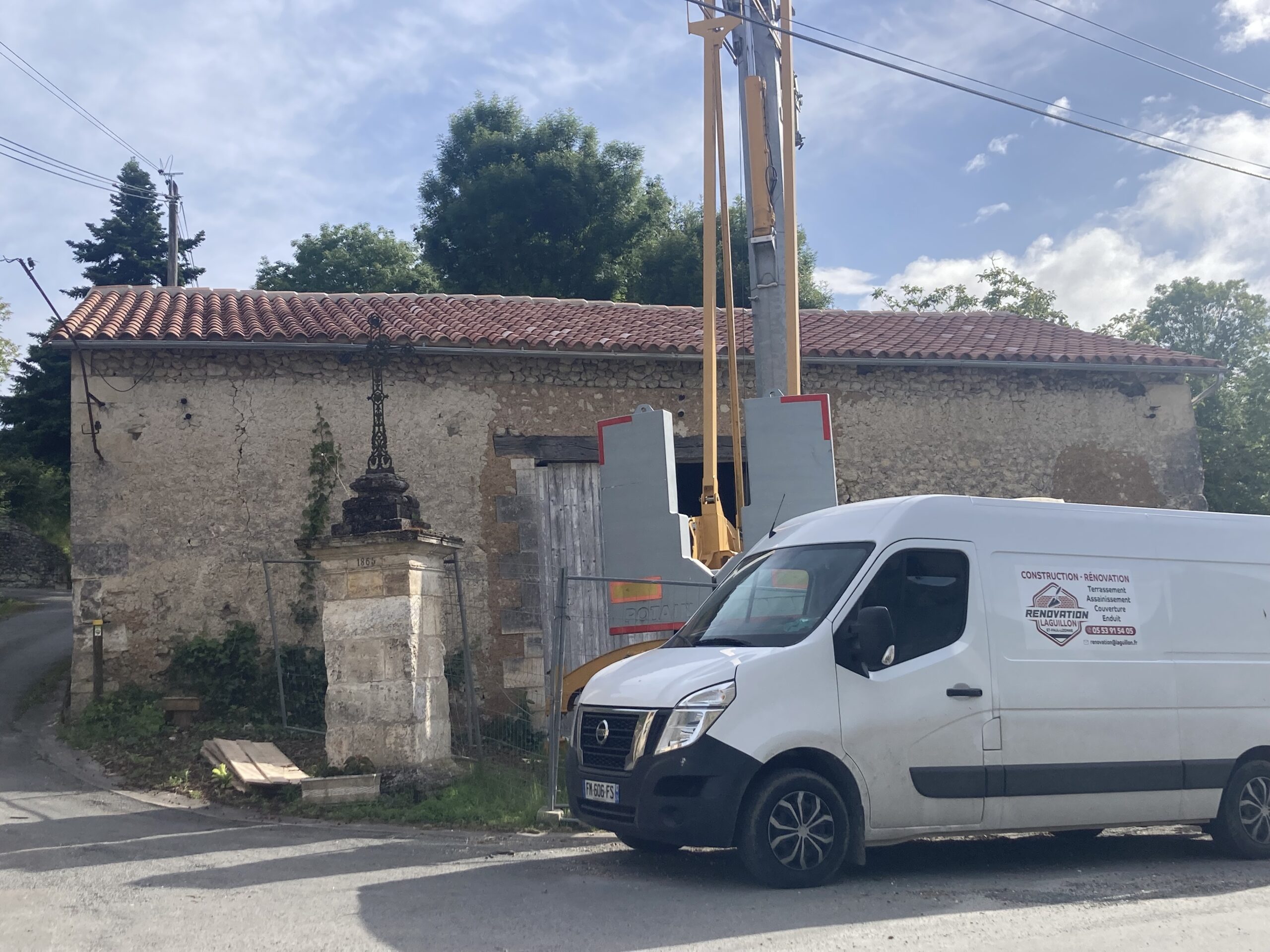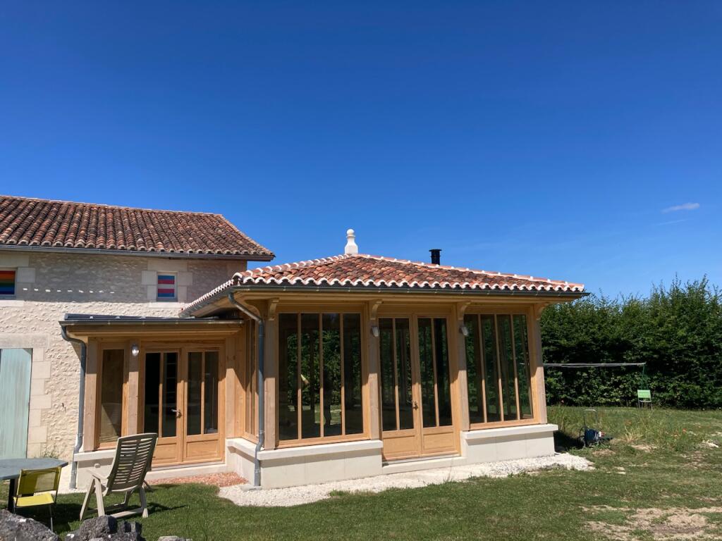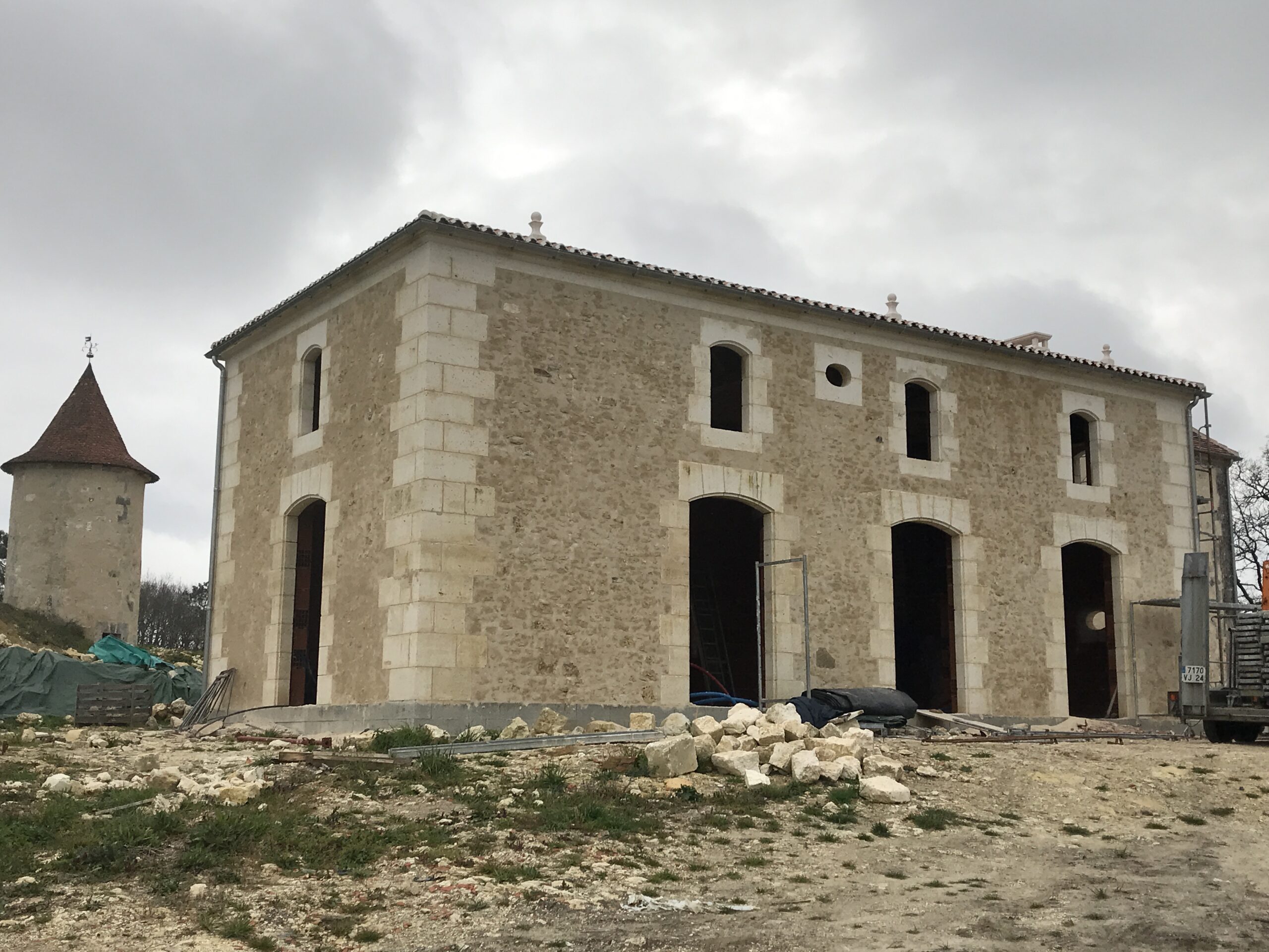 Construction en pierre de taille massive d’une extension d’habitation (24), couverture en tuiles canals de récupération posées sur crochets