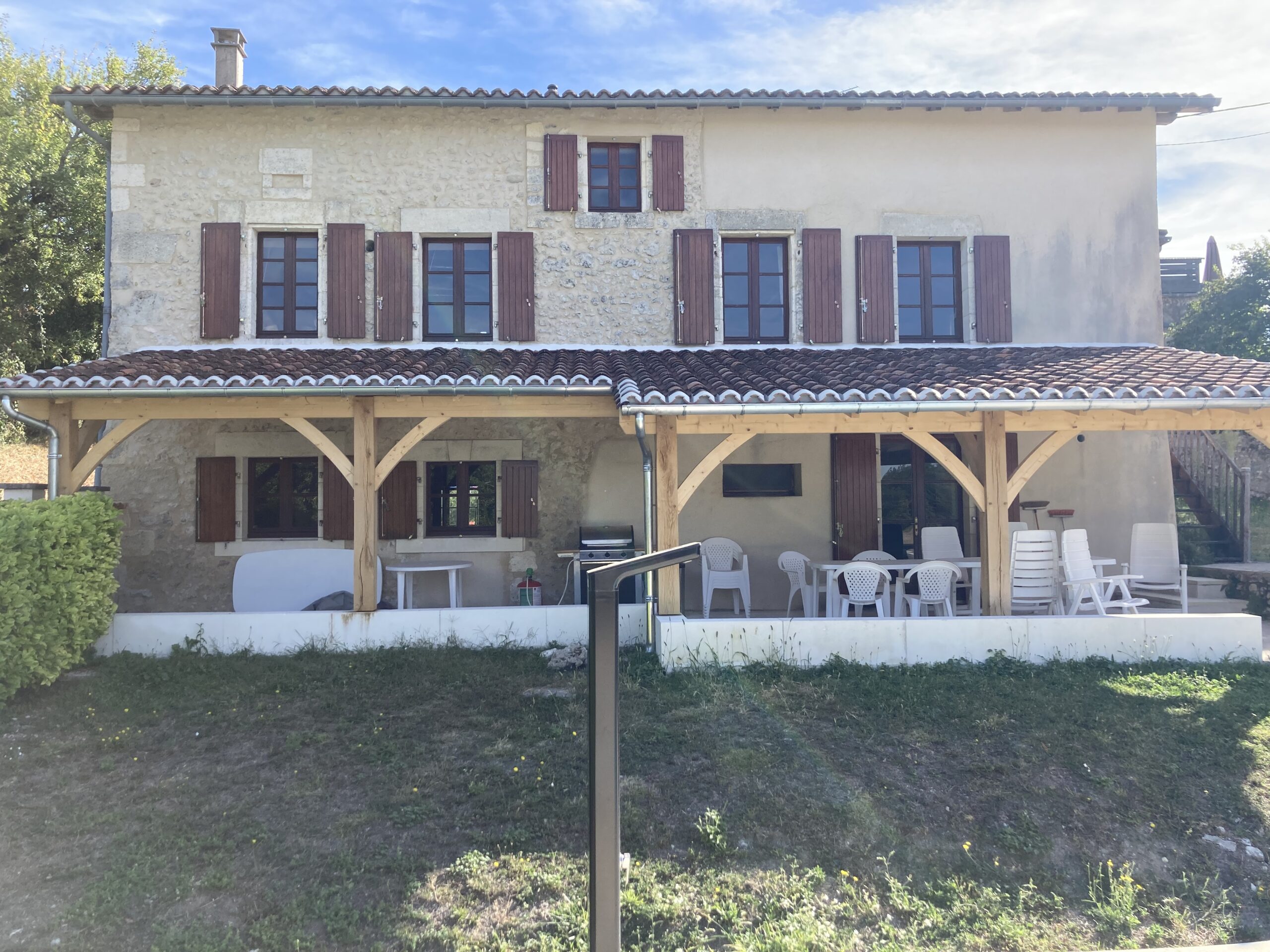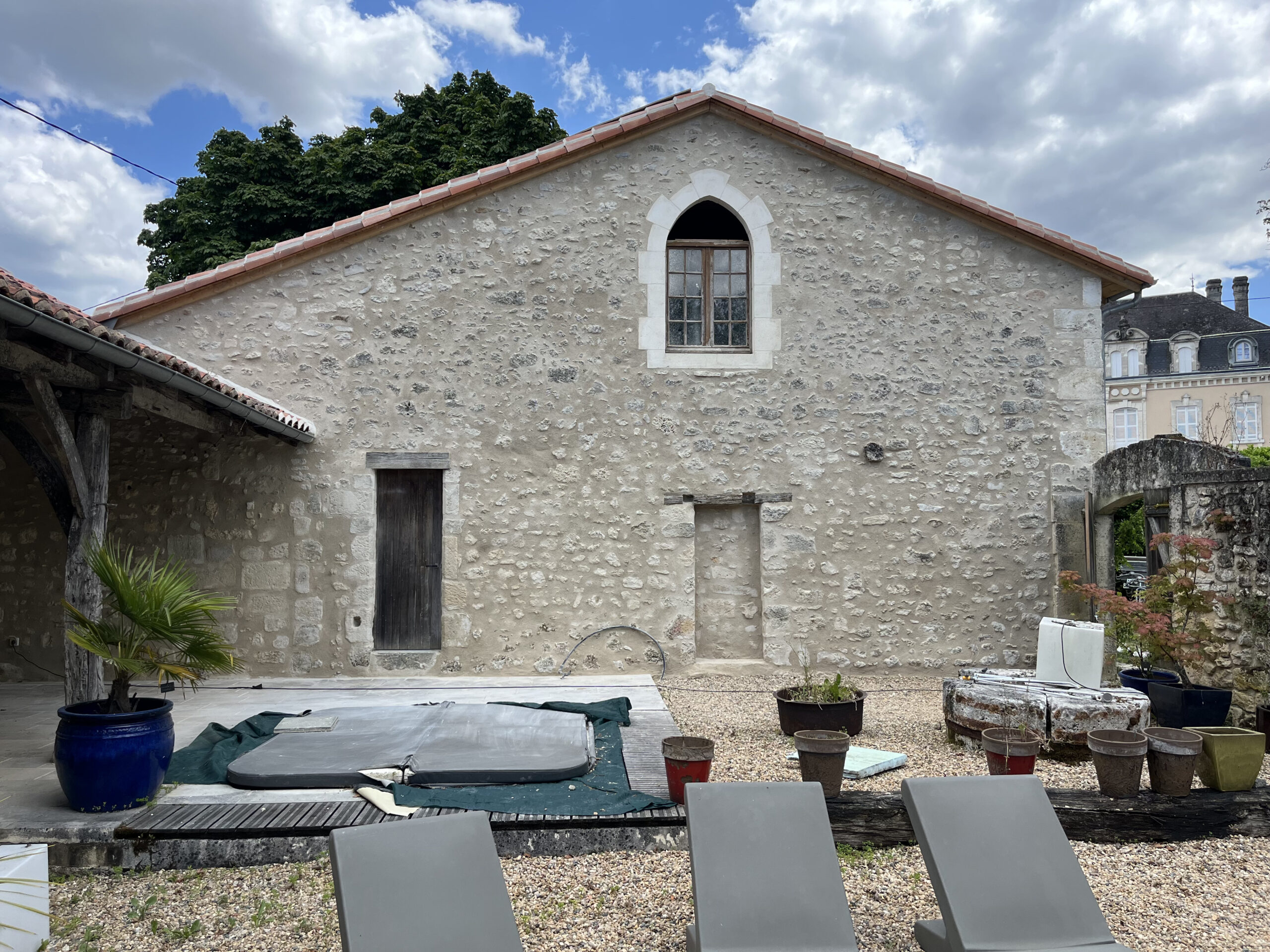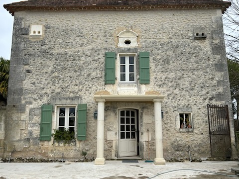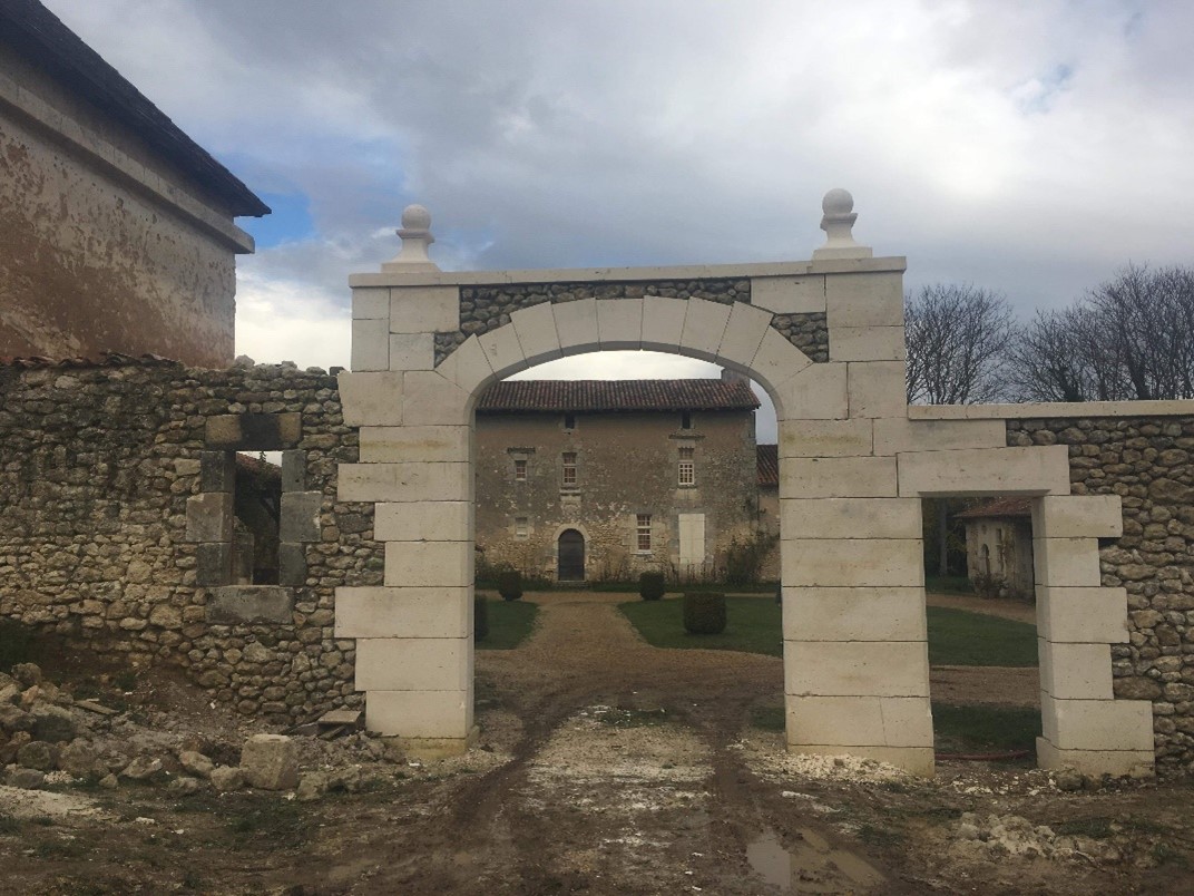 Aménagement extérieur : création d’un porche en pierre de taille maison de maître (24) et murettes.